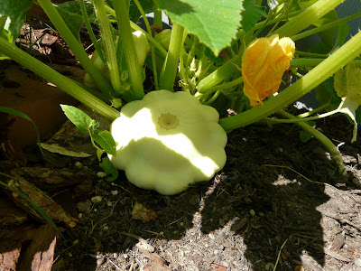 I've got lots of these squash below. The kids who sold the starts to me at a farmer's market said they were acorn squash, but they look more like patty pans to me. Either way...